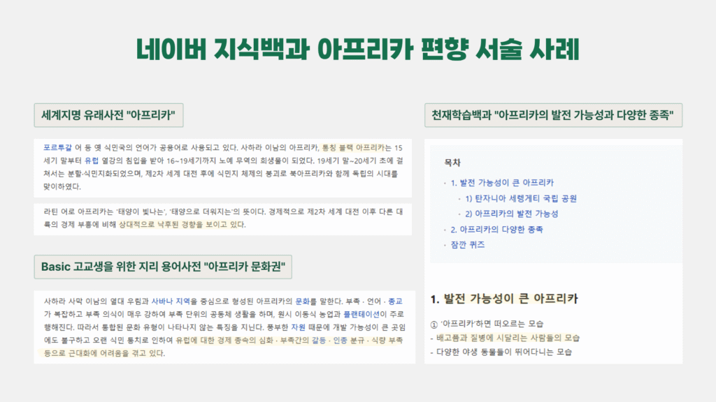 The analysis identified recurring patterns of bias in how Africa is described. The most notable issue was a simplified, dichotomous narrative that frames Africa as a “poor present with potential for the future.” Many entries emphasized poverty, disease, and desertification before concluding with “development potential,” while failing to adequately reflect contemporary changes such as urbanization, industrial growth, and the expansion of cultural industries. For example, one elementary-level entry presented “people suffering from hunger and disease” as the first image that comes to mind when thinking of Africa, reinforcing distorted perceptions.