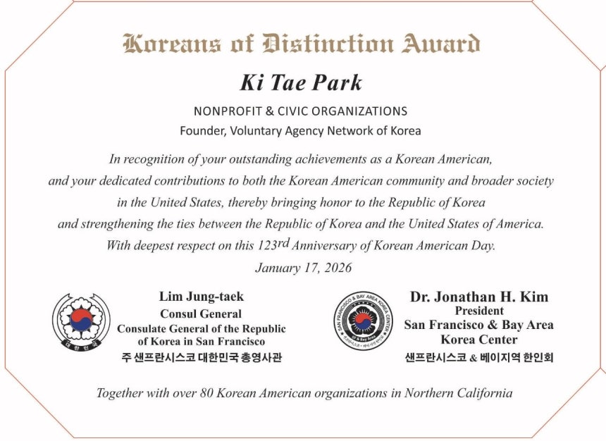 The award is jointly presented by the Consulate General of the Republic of Korea in San Francisco, headed by Consul General Lim Jung-taek, and the San Francisco & Bay Area Korean Association, chaired by Kim Han-il, with more than 80 Korean organizations across Northern California participating. It honors individuals who have contributed to both the Korean American community and U.S. society while enhancing the reputation of the Republic of Korea.