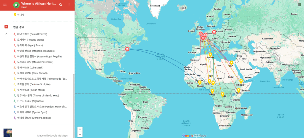 The digital map released by VANK is designed to present these movements and their historical background in an intuitive format. It displays both the place of origin and current location of African artifacts, with lines connecting the two points to visualize their routes of removal.