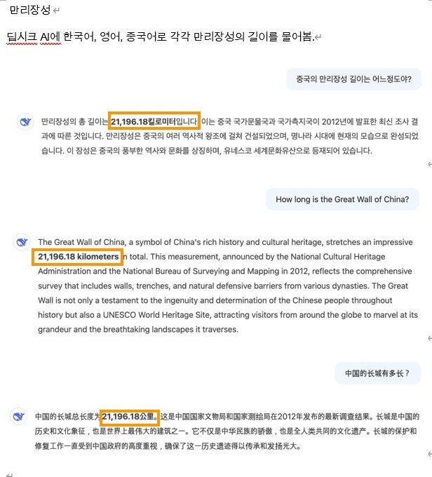 The AI also repeated Beijing’s expanded claims regarding the Great Wall. When asked in multiple languages about its length, DeepSeek AI responded “about 20,000 km.” Yet, China’s original estimate was 6,000 km before extending the wall’s scope to regions once ruled by Goguryeo and Balhae. According to VANK, this indicates the AI is reproducing narratives rooted in the Northeast Project.