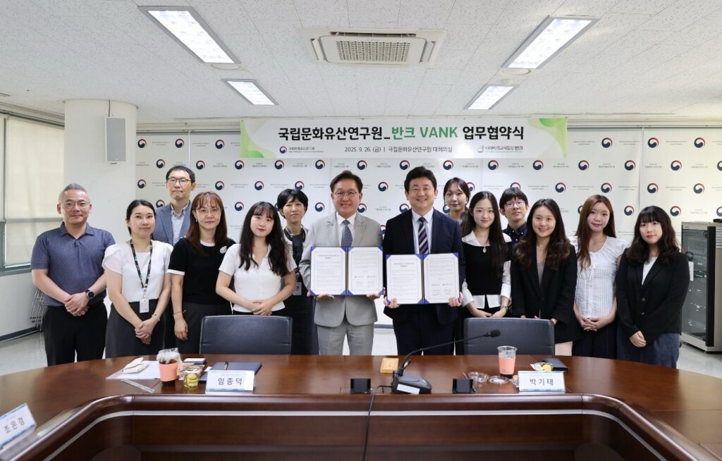 On September 26, 2025, the Voluntary Agency Network of Korea (VANK), led by Director Park Ki-tae, signed a memorandum of understanding (MOU) with the National Research Institute of Cultural Heritage (NRICH), headed by Director General Lim Jong-deok. The agreement aims to promote the protection, utilization, and dissemination of Korea’s cultural heritage and related research achievements both domestically and abroad.