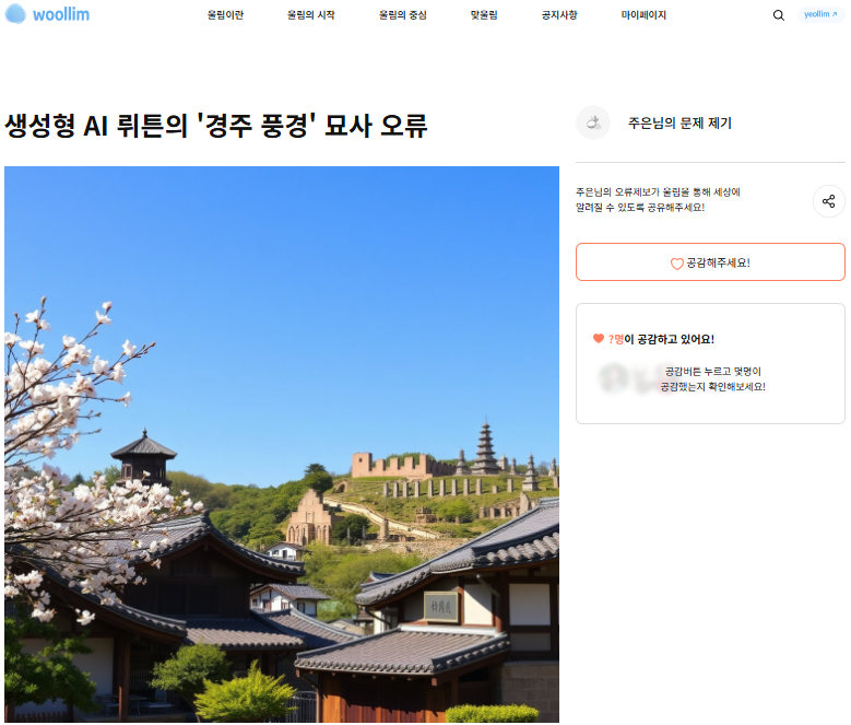 A participant in the VANK Korea Ambassador program, who identified herself by the nickname Jueun, discovered that the AI platform Wrtn generated completely inaccurate images when she requested a depiction of Gyeongju’s scenery. Despite asking for an image that would allow foreigners visiting Korea for the first time to appreciate the beauty and history of Korean culture, the AI produced results disconnected from Gyeongju’s historical identity. Notably, some generated images featured unrealistic stone structures resembling Japanese-style pagodas. She stressed that “AI-generated images can be used in tourism promotion and educational materials, so they must be based on accurate historical references.”