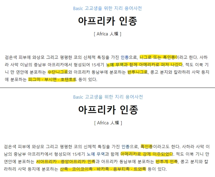 The review covered a wide range of materials, including elementary and secondary school educational content as well as general dictionaries. Specifically, the entries included “Africa” in the Elementary Social Studies Concept Dictionary, “Africa” in the World Place Name Origins Dictionary, “African race” in the Basic Geography Terminology Dictionary for high school students, and “Negro race” in the Basic Social and Science Knowledge for middle school students, among others.