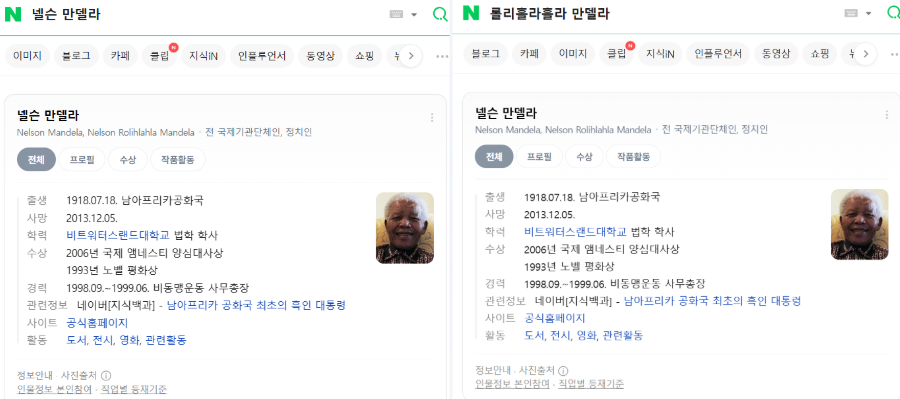 The latest outcome reflects VANK’s continued campaign to correct naming practices and build a knowledge ecosystem that respects African identity, with portal services actively adopting its recommendations. Previously, searching for “Nelson Mandela” on Naver displayed only the Western name “Nelson Mandela” in the profile, while searching for his original name, “Rolihlahla Mandela,” did not return the same profile information.