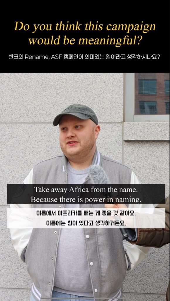 During the interviews, VANK also asked participants, “How would you feel if your country’s name were used as the name of a disease?” Many responded, “I’ve never thought about it, but it would feel very unfair,” reflecting on their own previously unexamined perceptions of ASF and acknowledging underlying bias.